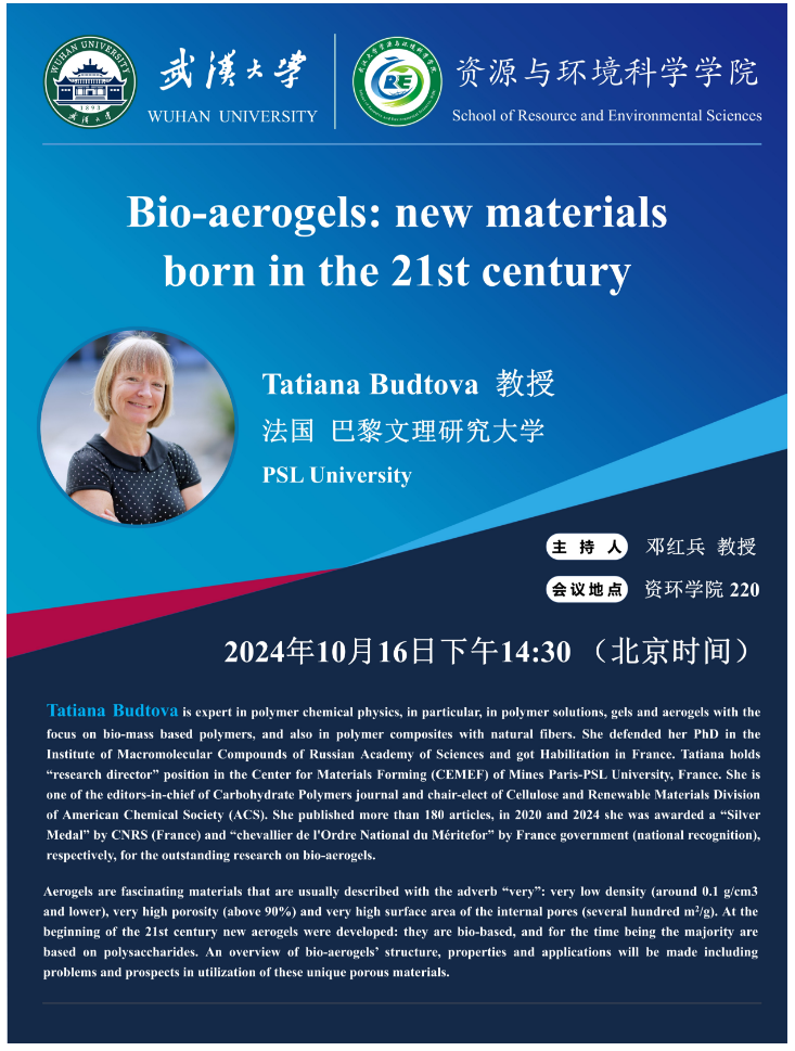 【学术讲座】10月16日下午法国巴黎文理研究大学Tatiana Budtova教授 Bio-aerogels:new materials born in the 21st century
