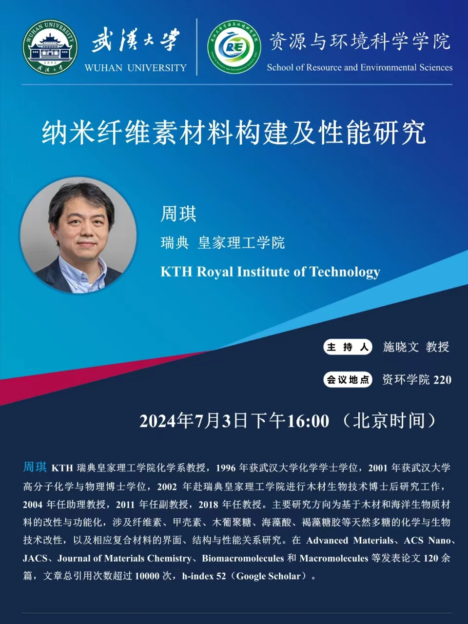【学术讲座】7月3日 瑞典皇家理工学院周琪教授 纳米纤维素材料构建及性能研究
