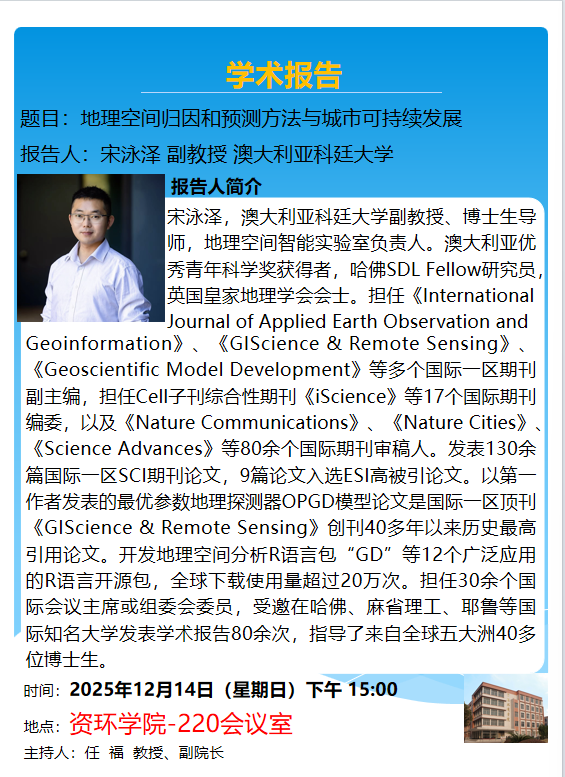 【学术讲座】12月14日下午 澳大利亚科廷大学 宋泳泽副教授 地理空间归因和预测方法与城市可持续发展