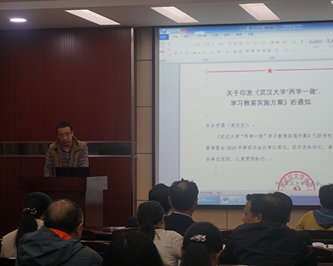 学院党委书记彭宇文介绍了学校“两学一做”学习教育实施方案。他以“两学一做”学习教育的目标要求、主要内容、方法措施、组织领导四个方面为切入点,强调了此次教育学习的重要性。同时,也对学院“两学一做”学习教育相关工作做了部署并提出了三点要求:一是全体党员在思想上要高度重视,立足学院长远发展、学科建设的角度,从本质上把握“两学一做”学习教育的总要求;二是各党支部在开展工作中要认真组织,结合学校实施方案指定具体学习计划,要特别注意档案建设,实行痕迹管理制度;三是在学习教育中既要按照文件要求组织专题学习,又要结合学院工作实际讲求实效。