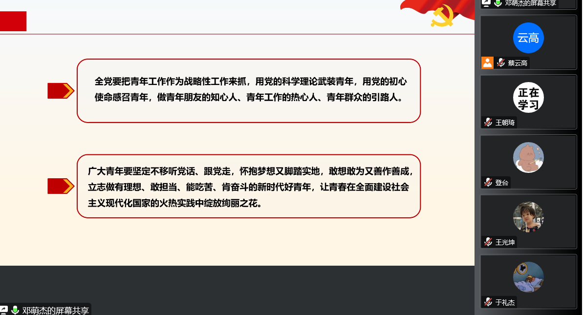 最后,副书记邓萌杰同志用习近平总书记的话来激励支部同志:“党用伟大奋斗创造了百年伟业,也一定能用新的伟大奋斗创造新的伟业。全党全军全国各族人民要紧密团结在党中央周围,牢记空谈误国、实干兴邦,坚定信心、同心同德,埋头苦干、奋勇前进,为全面建设社会主义现代化国家、全面推进中华民族伟大复兴而团结奋斗!”相信支部同志在此激励下,将更加严格要求自己,作为学生作为青年,认真对待科研工作,成为大家的好榜样!