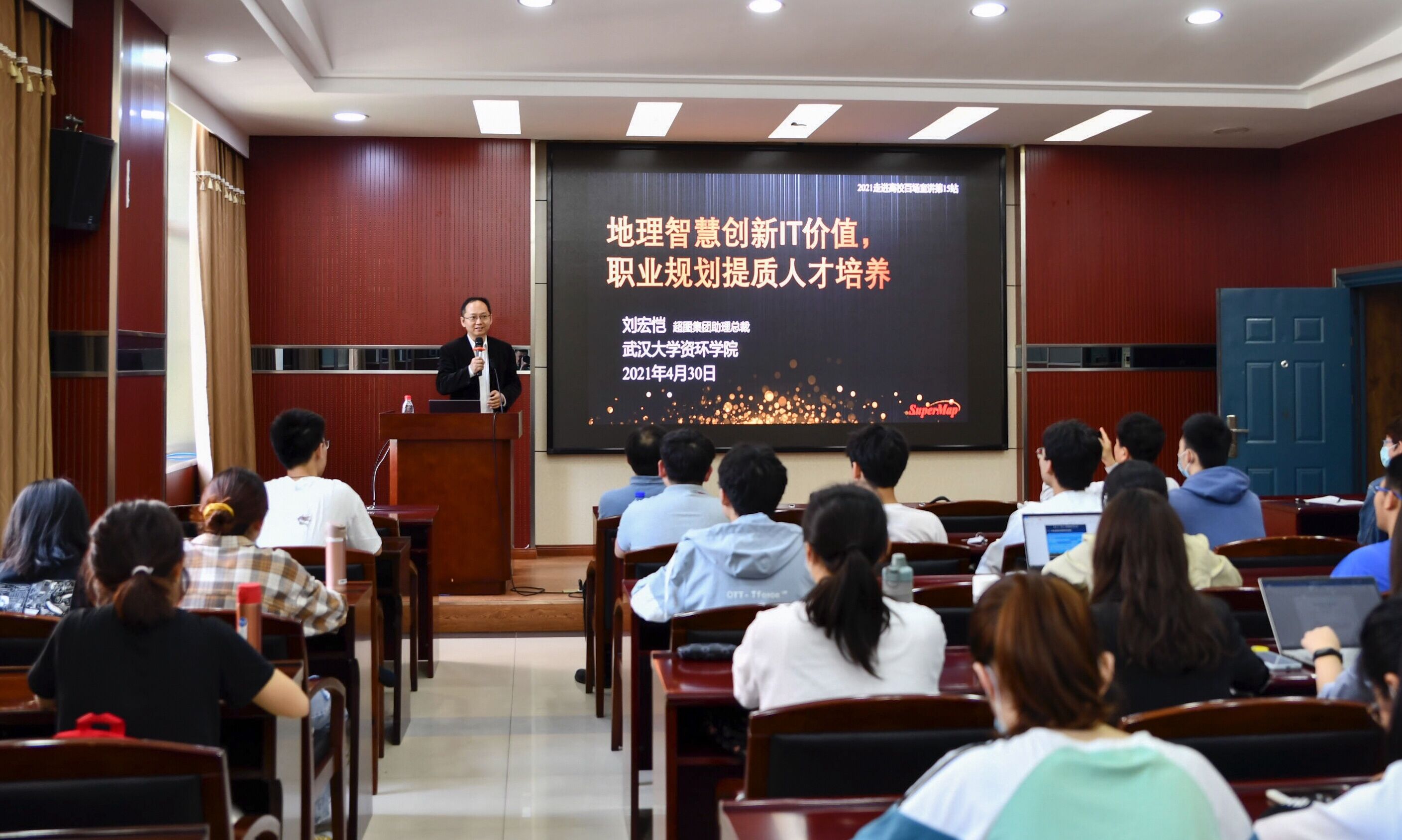 据悉,超图集团与我校有共建“GIS教学及应用创新中心”,我校学生也长期参加SuperMap杯高校GIS大赛并多次获奖,校企双方有良好的合作基础。本次讲座不但让GIS专业学生了解了最新的行业态势,增强了职业生涯规划意识,同时搭建了学生与行业标杆企业间的零距离沟通平台,有助于校企交流。
