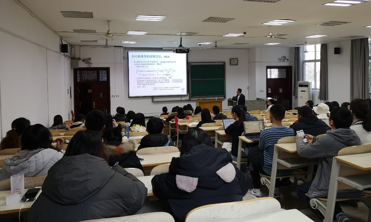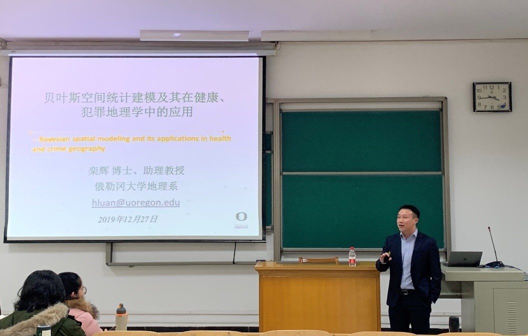 之后,栾辉博士作了题为“贝叶斯空间统计建模及其在健康、犯罪地理学中的应用”的学术报告。首先从空间分析建模的必要性、具体方法以及贝叶斯空间建模方法的实现原理与优势切入,对其主要研究领域的核心理论进行了细致的讲解,使听众更好地对贝叶斯理论有了深入认识;借助“24小时内加拿大滑铁卢地区报警电话的时空分布”与“加拿大Kitchener市社区尺度上餐馆健康指数的建立”两个研究实例分别论证了贝叶斯统计方法在拟合离散与连续的时空数据上具有的优势,为理论结合实际应用做出了良好的示范。