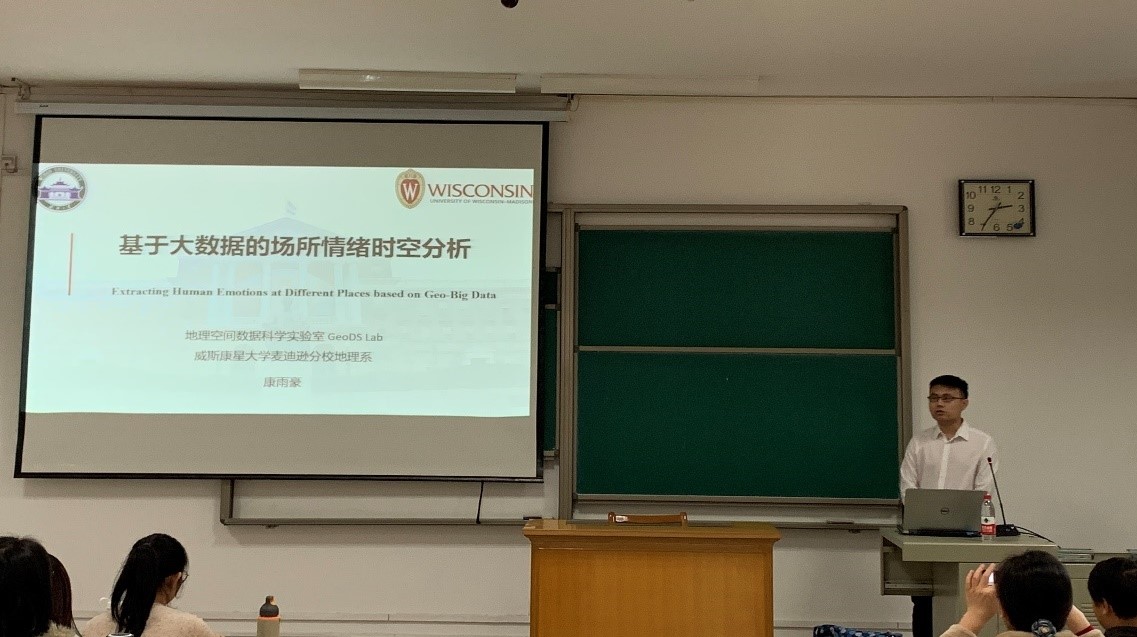 康雨豪校友的报告题目是“基于大数据的场所情绪时空分析”,从基于场所的情绪计算框架和环境与人类情绪关系探索展开,阐释了如何通过大数据采集构建“场所”的概念表达,并就引入机器学习的情感分析方法与量化情绪与环境关系的方法进行了剖析,最终凭借严谨的研究思维与前沿的学术思想,为在场师生带来了深刻启迪。此外,康雨豪博士还就自身的学术与科研经历进行了介绍,鼓励大家培养起对新技术、新理论的热情,积极努力、投身科研。