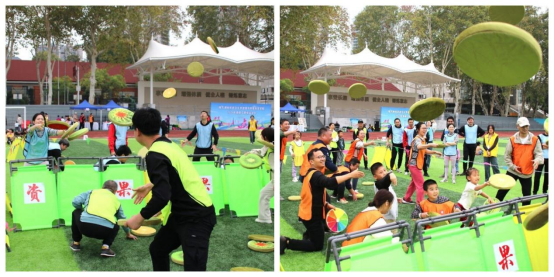 在“资果果拼”比赛中,队员们努力将水果飞盘扔向对方赛场区域,并迅速将我方区域飞入的水果飞盘扔回对方。这场水果大战激烈而有趣,教职工们比完了,孩子们也加入进来,成了一场亲子互动的游戏。