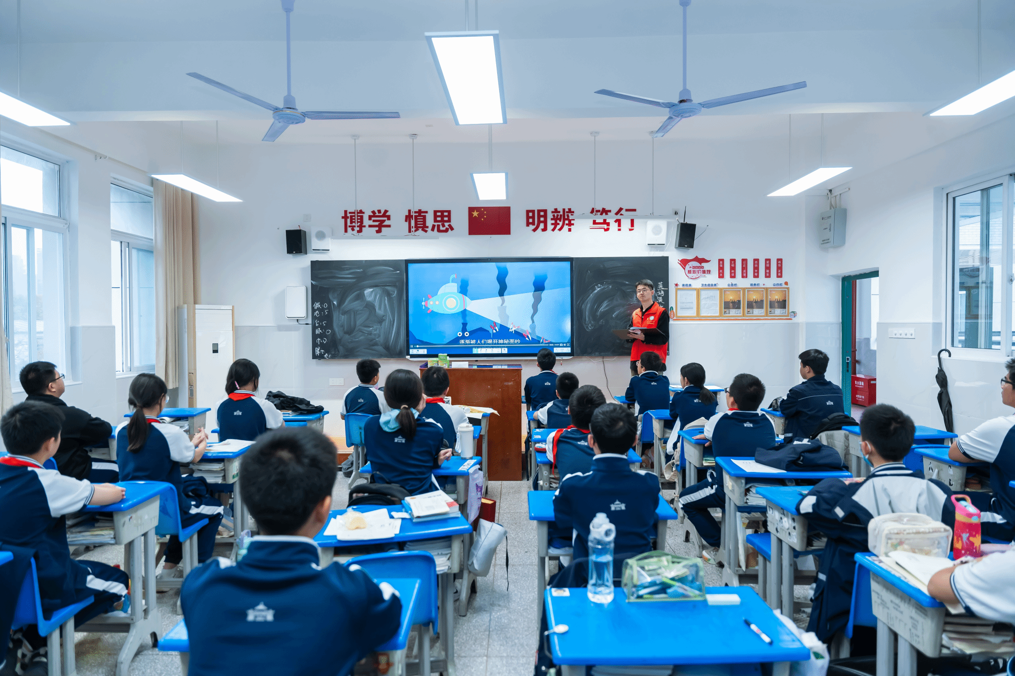 附属外语学校八年级的12个班级,为540余名初中生讲解海洋知识,引领大家理解海洋强国战略的意义,激发中学生对科技前沿的兴趣。课堂上,学院的研究生党员们化身12个班级的讲师,从临海而生、凭海而兴、向海图强三个角度出发,对海洋知识进行了生动地讲解,帮助同学们构建知识框架。