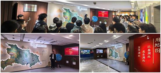 湖北省地图院谭竞漪主任与张海静博士等人热情接待了学院师生,张海静博士全程担任专业讲解。师生们首先参观了"地图成果1号厅",张博士详细介绍了湖北省地图院近年来的重要地图成果和代表性项目。