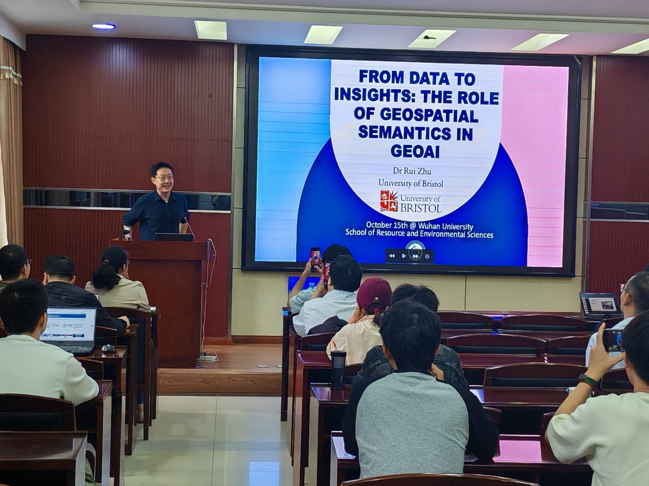 Rui Zhu 博士现任英国布里斯托大学地理科学学院空间数据科学高级讲师,聚焦人、机、环境三者交互,解决地理空间数据互操作性、时空推理等问题,成果应用于城市研究、全球健康等领域。报告中,Rui Zhu 博士以 “From Data to Insights: The Role of Geospatial Semantics in GeoAI” 为题,回顾过去二十年地理空间语义与本体论在地理信息科学中的核心作用,结合地理人工智能发展趋势,探讨 “地理空间语义对 AI 时空推理的支撑逻辑”,展示知识图谱、空间显式机器学习等技术,剖析领域融合的挑战与机遇。