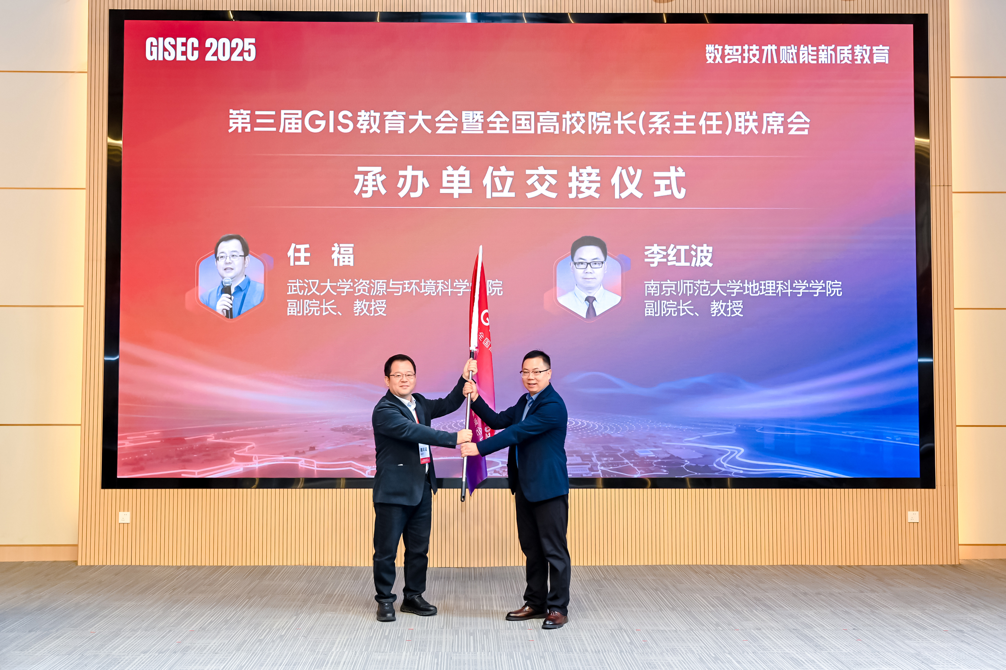 ,向“第三届GIS教育大会”承办单位南京师范大学地理科学学院副院长李红波教授递交大会会旗。