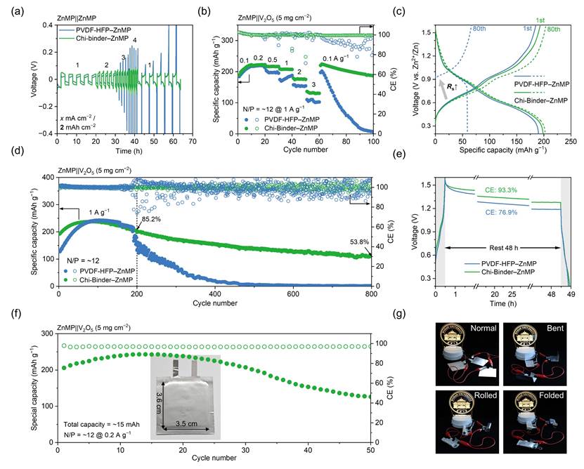 通过电化学性能测试,验证了Chi-Binder对锌粉电极电化学性能的提升。原位光镜观察发现,Chi-Binder电极在200分钟的锌沉积过程中表面保持平整,无气泡产生;而PVDF-HFP电极则出现不规则沉积并伴有气泡产生。对称电池测试中,Chi-Binder-ZnMP电极在0.5 mA cm⁻²/0.5 mAh cm⁻² 条件下循环寿命超过700小时,远优于对照电极。即使在深度放电条件下,电极仍表现出良好的循环稳定性。全电池测试中,采用Chi-Binder的ZnMP||V₂O₅电池在高倍率下容量保持率更高,且具备良好的抗自放电能力和机械柔韧性,在弯曲、折叠等恶劣条件下仍能稳定工作。