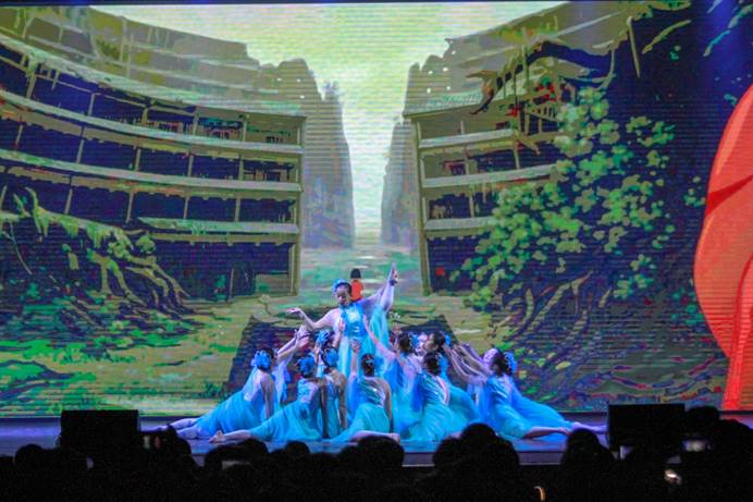只见舞台上蓝色的衣裙翻飞,舞者们动作统一整齐,呈现出令人赞叹不已的视觉效果。舞蹈队员们每一次旋转、每一次俯身,力量中有柔和,舒缓中有灵动;她们每一次翘首、每一次垂眸,深情中有释放,哀恸中有张扬。富有感染力的舞蹈表演将每一个人带入到《大鱼海棠》的故事情境中,牵动着每一个观众的心弦。
