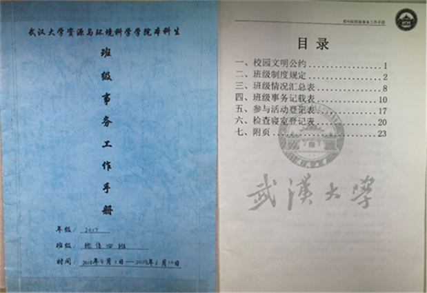 在年级辅导员马丽华老师印制的班级事务工作手册中,不仅有对每位班委工作职责的明确要求,班委还认真记录了全年的班团工作、大家参与活动的情况等。