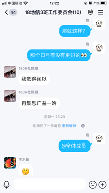在主题团日活动大致确定后,团支部成员经过三天的讨论打磨,不断地打磨方案,不断地交流看法,最后一致确定了每位同学围绕主题拍摄短视频的活动形式。