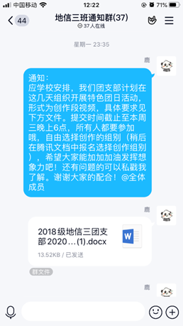 突如其来的病毒,打破了原本平静的生活,疫情肆虐,地不分南北,人不分老少,都有阻击疫情的责任,作为共青团员的我们,尤其是求学武汉的我们,心早已与这所英雄城市紧紧相连,都在用自己的方式尽到一份担当。在这个特殊的时期,为了增加同学们对疫情的正确关注和了解,坚定同学们抗疫的信心,指导同学们在家中的学习,在校团委的号召下,我们2018级地信三班团支部开展了“青春战‘疫’,共克时艰”网上主题团日活动。