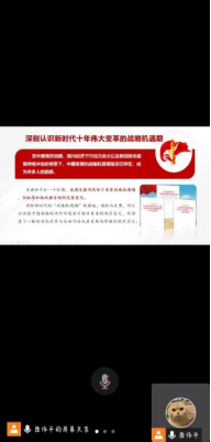 最后,全体同学一起重温了党的二十大精神,深刻认识了新时代十年伟大变革的战略机遇,学习了榜样珞珈的优秀事例。并开展交流互动环节,互相解答了有关新学期的疑惑,分享了自己对于榜样珞珈优秀事例的思考与学习。