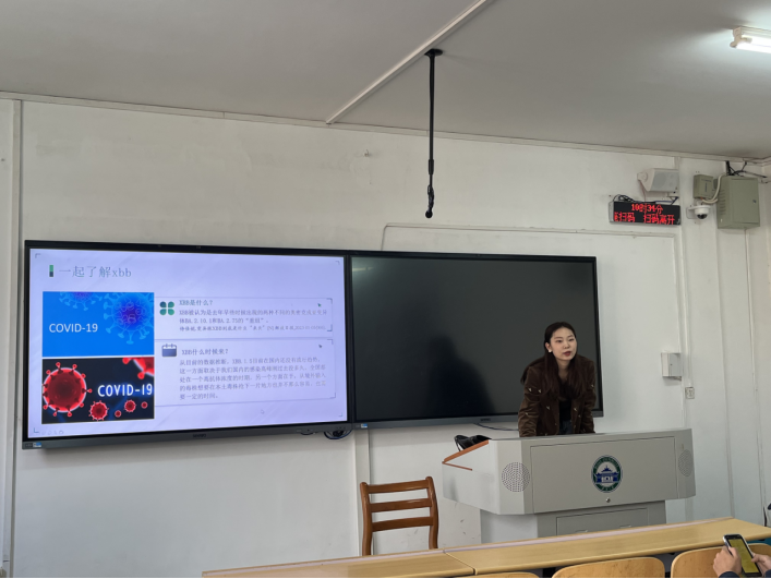 班会第一项,王馨茹同学为大家讲解了当下应如何正确看待疫情防控。从中国为全球抗疫做出的贡献到中国与其他国家死亡病例的对比,再带着全班同学一起了解xbb,王馨茹的讲解让同学们对中国的疫情防控有了一个更深层次的理解。