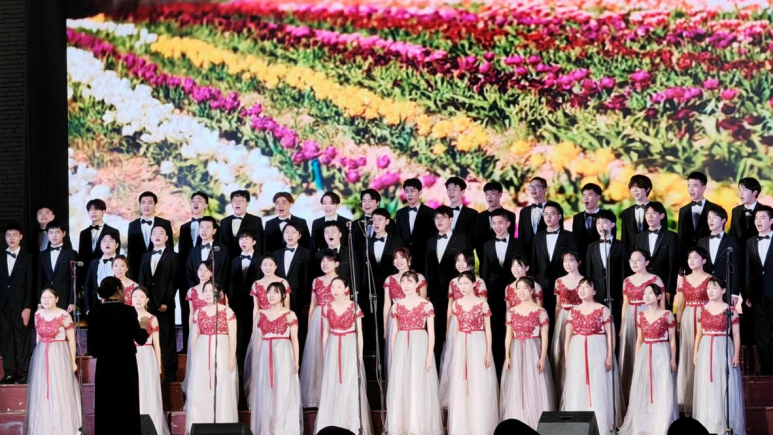 与国网院联合合唱团的男队员身着黑色西装,系着黑色蝴蝶结领巾,雄赳赳气昂昂地踏上舞台,女队员提着白色裙摆,身着一抹中国红,轻盈上台。踩青时的欢快,年轻时的懵懂清纯,在一句句轻快的歌声里铺展开来,一曲青海民歌欢快,带动人的心弦,让观众也不住地随着歌声舞动。队员们的情感也随歌声进入高潮,一句“呀嘿”加上一声清脆的鼓掌,结束了这首《花儿与少年》。歌曲虽已终,少年在花儿中藏入的情却愈加绵长。
