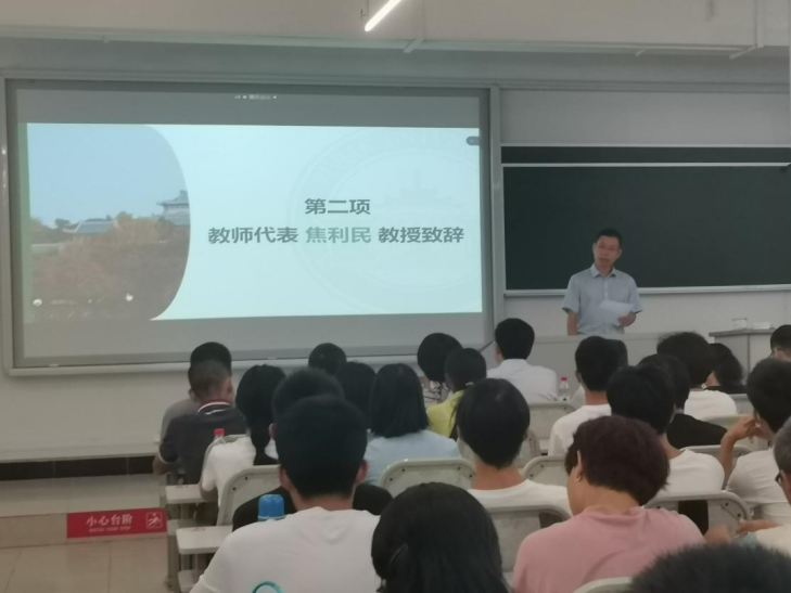 在全体与会人员坐下后,教师代表焦利民教授上台发言。焦教授向大家提出了三点期望——保持你的热情与梦想、拓宽你的视野与格局、永远不放弃努力与奋斗!焦教授也祝愿道:“希望你们在这里经历全面的成长,在老王论坛