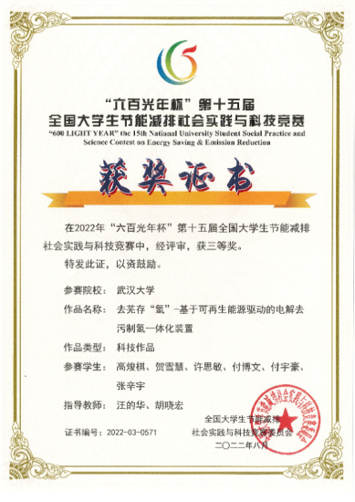2019级本科生高焌棋作为队长主持的项目《去芜存“氢”——基于可再生能源驱动的电解去污制氢一体化装置》获全国三等奖,项目成员还包括老王论坛