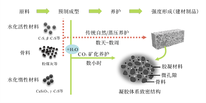 针对二氧化碳矿化养护传统混凝土所带来的环境压力和资源消耗,本团队基于二氧化碳矿化养护技术,考虑如何减少水泥消耗量和对已排出的二氧化碳进行回收利用,设计了一种基于尾矿和尾气处理的新型改进方法——二氧化碳矿化养护尾矿基砌块。