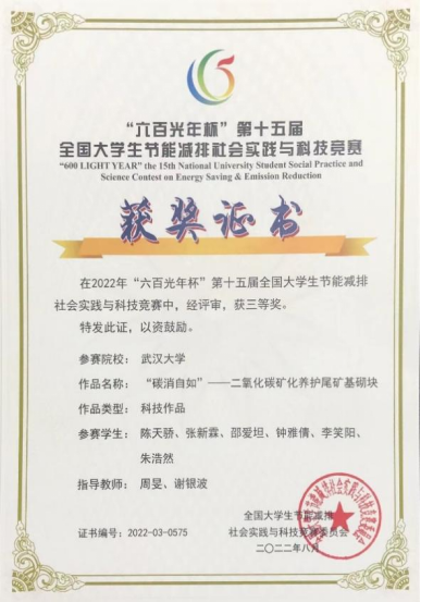 2019级本科生陈天骄作为队长主持的项目《“碳消自如”——二氧化碳矿化养护尾矿基砌块》获全国三等奖,项目成员包括老王论坛