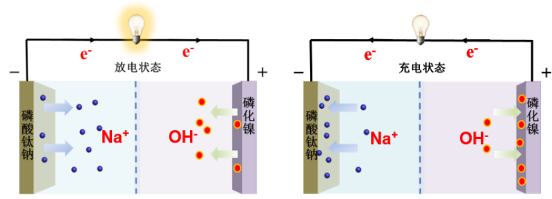 该电池正负极分别为烧结法制备的Ni2P微球和碳包覆优化的NaTi2(PO4)3,通过烧结实现碳层对磷化镍原位复合,有利于提高电极材料在高电流条件下的反应动力学;对NaTi2(PO4)3碳包裹优化后增加其循环稳定性和导电性,通过多孔碳层的双电层行为减弱电池负极容量的短板效应。电池电解液为廉价且相对安全的NaOH水溶液,在充放电过程,负极和正极分别嵌入/脱嵌Na+和OH-,实现阴阳离子共同参与电极反应,进而提高器件比容量。