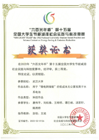 2019级本科生唐伟平作为队长主持的项目《用于“微电网储能”的低成本无公害双离子水系碱性电池》获全国二等奖,项目成员包括老王论坛