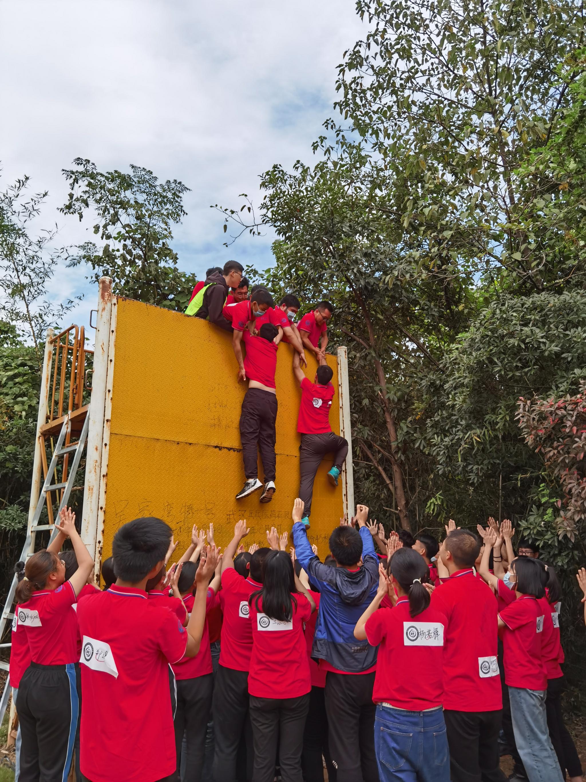 近四米的光滑高墙,如何才能翻越?三十人的团队要怎样安排才是合理高效的?无数的问题在倒计时开始前涌入脑海,又在开始瞬间被抛之脑后,每一个团队都迅速摸索出适合自己的方案,强健的同学们自愿在最下面一层担当最坚实的后盾,有力的同学则爬上顶端帮助后面的同学。汗湿了衣襟,热情与力量燃烧在内心。随着上去的同学越来越多,压力留给了在下面的同学,但是每一个团队都坚信“不抛弃不放弃”、“一个都不能少”,同学们通力合作,争取让每一位同学都有机会翻越高墙。