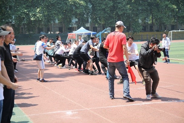 比赛有条不紊地进行。比赛过程中,工作人员穿梭于主席台间,尽心尽力;参赛者则活跃于赛场上,欢笑不断,拼搏不息。整场运动会于接近午时推向高潮。随着拔河比赛的开始,全场师生全情投入、咬牙奋力,比赛过程中各方选手也势均力敌,使得这场团队协作更加精彩。紧随其后的接力比赛中,各队选手全速奔跑在赛道上,场外加油呐喊声不断。活力与热情飞扬在赛场上,如这五月的朝阳般光芒万丈。