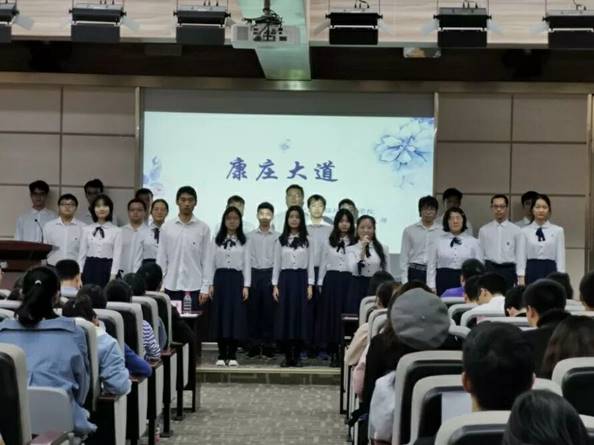 在团支部风采展示环节,全体团支部成员进行了展示——《康庄大道》。节目包含诗朗诵和手语表演《国家》,通过多种方式诠释支部建设的特色与亮点,展现支部成员的精神风貌,体现支部的学“习”认同与实际成效。